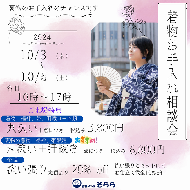 お着物お手入れ相談会 夏のお着物や帯は収納前のメンテナンスをお奨めします。 丸洗いやシミ抜きからお仕立替え等、お着物に関するご相談は何なりとお気軽にお問い合わせ下さいませ。 会場:奈良市大宮町6-9-1 新大宮ビル4F 着物メンテそらら ご予約...