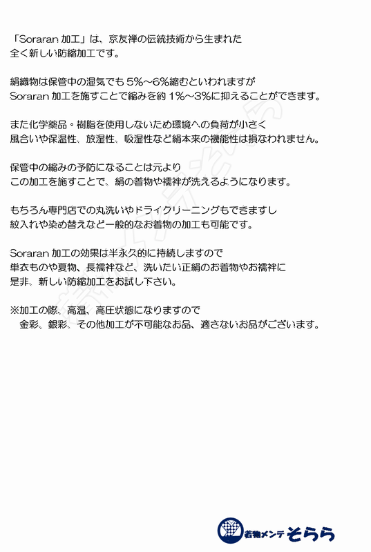 Soraran加工(そららんかこう)は、京友禅の伝統技術を応用した防縮加工で、