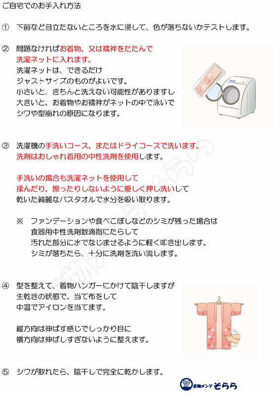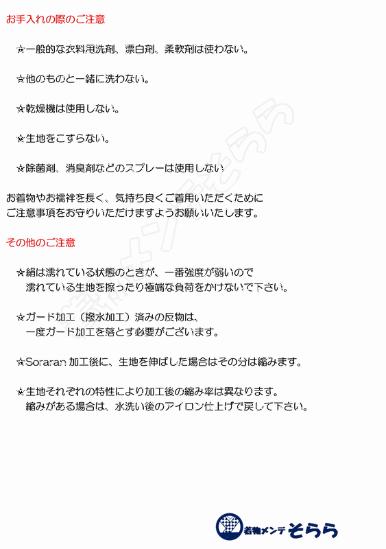 正絹素材でもSoraran加工(そららん加工)を施すことによりご自宅での洗濯が可能となります。