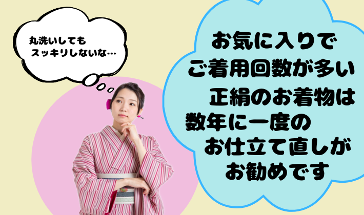 お気に入りのお着物は出番が多い分、どうしても汚れます。お手入れに出しても、何だかスッキリ綺麗に仕上がらない表にシワがはいってしまう、という場合はお仕立て直しが必要な時期になっていると思います。洗い張りをいたしますと、丸洗いでは落ちなかっ... -